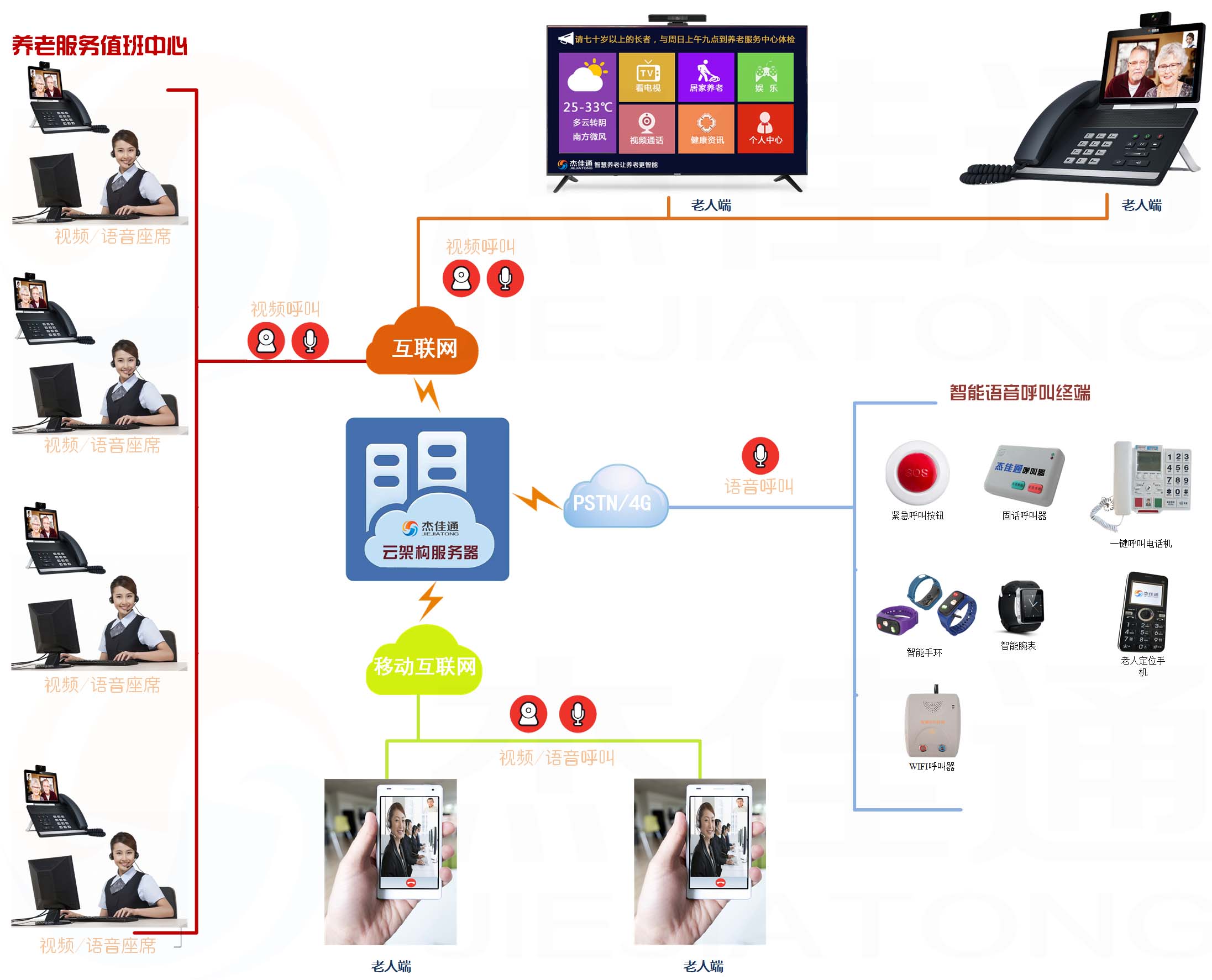 杰佳通自主研發(fā)的智慧養(yǎng)老平臺(tái)中把可視化功能完美應(yīng)用于老人需求提交,看得見的養(yǎng)老服務(wù)--視頻應(yīng)用在智慧養(yǎng)老平臺(tái)中得到充分體現(xiàn),老人可以通過(guò)“智能手機(jī)”、“電視”、“平板電腦”進(jìn)行可視化(視頻)呼叫服務(wù)中心或者服務(wù)商和子女。